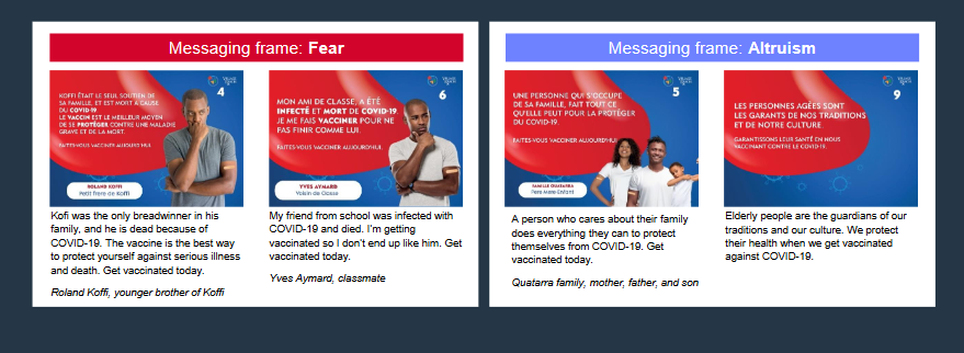 - Cultural or Social Norms: aligning the messaging with prevalent cultural values or societal norms to influence behaviour (e.g., "Getting vaccinated shows the world you are a mother who cares about her family.")
