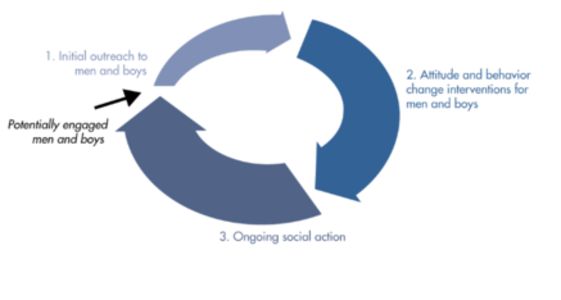 In summarising the knowledge base regarding engaging men and boys in prevention through a gender transformative lens, the authors' aim is not to elevate men's participation as an end unto itself. Instead, they argue for the importance of males in violence prevention as one integral component of comprehensive efforts to end violence globally and ultimately, to promote gender justice. The project of engaging men requires careful thinking about how to appeal to men without reinforcing notions of gender hierarchy, they argue. As noted, efforts to increase men's anti-violence involvement are myriad and include, but are not limited to, one-time community events, standardised interventions aimed at violence-related attitude and behaviour change, and a range of community outreach, education, mobilisation, and social action efforts. In addition to their heterogeneity, activities under the umbrella of "men's engagement" encompass a temporal dimension. To that end, Figure 1 depicts a proposed conceptual model, in which initial recruitment of men and boys provides a conduit to formalised prevention events and interventions, which, in turn hold promise for fostering activism and integration into larger GBV prevention efforts and, more broadly, gender justice movements. Subsequent activism (in addition to potentially addressing structural factors that support gender GBV) can generate new spaces in which initial outreach to previously unengaged men may occur.
