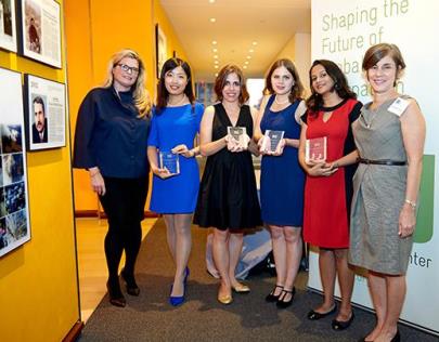 Image credit/caption: Aaron Thompson - The 2014 contest winners with Danielle J. Devine, vice president of corporate communication for Johnson & Johnson (left), and ICFJ president Joyce Barnathan (right).