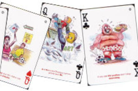 One CompuTainer creation is "casino quality playing cards", each of which includes a custom message discussing HIV and AIDS. The cards have been built around the theme of sport: specifically, soccer. Thus, the theme of athletics is being used to transmit messaging around Abstinence, Being Faithful, and Condomising (the "ABCs"_). For instance, one card features 2 friends (one black, one white) with bubble conversations over their heads - one friend says, "I don't want to use a condom...we don't get the real feeling when we use a condom". His friend, who is holding a soccer ball, says "It's not true...we don't lose any feeling...sorry...no condom...no sex!"). Organisers have also integrated topics such as gender issues, "myth busting", promoting voluntary counseling and testing (VCT), good nutrition, regular exercise, living positively, exposing risky behaviour, and positive leadership. For example, the queen of hearts card features a drawing of a woman triumphantly holding a paper reading "HIV Test Result"; there is a "know your status" poster displayed on the card, with the red AIDS ribbon, and a boy on a bench sporting a soccer ball. The written message on this particular card is "Not knowing your status can be stressful." Another card portrays two women attending a soccer match, with a bubble over their heads that reads "Psst...I heard that Kenny has HIV and that..." The message is that spreading rumours is cruel and hurtful.