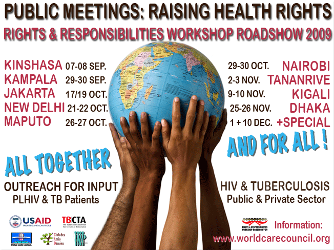 As of late 2009, the "Rights & Responsibilities Workshop Roadshow 2009", described as "live and direct outreach for input on HIV and TB", was taking place September-November through public meetings in the following locations: Kinshasa, Democratic Republic of the Congo; New Delhi, India; Jakarta, Indonesia; Nairobi, Kenya; Maputo, Mozambique; Kampala, Uganda; Kigali, Rwanda; Dhaka, Bangladesh; and Antananarivo, Madagascar. Sponsored by the World Care Council, its website (now closed, but its Facebook page remains open) invited input on the organisation of the tour, as well as on the document.
