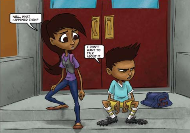 Just a Story, a comic book on parent conflict and its effect on children, is from the Canadian organisation The Healthy Aboriginal Network. In the story, a young girl doesn’t have any friends her age and feels overwhelmed at school. Her little brother is more social, but he’s quick to lose his temper and get into fights. What is underlying their feelings is the atmosphere at home created by their parents' fights. As a result of a conversation with a teacher who detects the problems through the writing of the young girl, the brother and sister open themselves to getting help and breaking down the stigma of mental health. It is designated as culturally appropriate by The Healthy Aboriginal Network.
