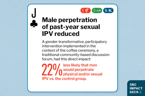 Strategy researched A gender-transformative, participatory intervention delivered to men, women, or couples in Ethiopia to prevent intimate partner violence (IPV) that was implemented in the context of the coffee ceremony, a traditional community-based discussion forum Impact achieved Country of study Ethiopia Research methodology Cluster RCT with 6,770 households Journal Journal paper title and link Excerpt from Abstract "A gender-transformative intervention delivered to men was effective in reducing self-reported perpetration of sexual IPV but did not reduce IPV when delivered to couples or women. We found evidence of decreased sexual IPV with men's UBL across men's and women's reports and of increased HIV knowledge and condom use at last intercourse among women. The men's UBL intervention could help accelerate progress towards gender equality and combating HIV/AIDS." |