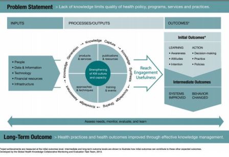 "The Knowledge Management for Global Health Logic Model shows how KM program inputs, processes, and outputs work together to achieve intended health outcomes. KM inputs (people, data and information, technology, financial resources, and infrastructure) feed into 5 processes that make up the knowledge cycle (knowledge assessment, generation, capture, synthesis, and sharing) that, in a myriad of combinations, creates KM outputs, or tools. Knowledge management processes are supported by a strong KM culture and strengthened KM capacity. KM tools are measured in terms of reach, engagement, and usefulness and result in learning and action. Drawing on Rogers’ Diffusion of Innovation theory of how people adopt a new idea,6 the logic model illustrates how people generally move through an ‘‘innovation-decision process’’ when putting new knowledge to use, from initial awareness of the knowledge and intention to use that knowledge (learning) to actually using the new knowledge through informed decisions, improved practices, and better policies (action). These actions translate into strengthened systems, changed behavior, and ultimately improved health outcomes." (See Related Summary below for further discussion of KM.)