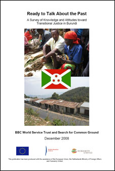 This 35-page report presents the findings from a survey on public knowledge and perceptions of transitional justice in Burundi. The survey was carried out in Burundi in October 2008 by the Research and Learning Group of the BBC World Service Trust and Search for Common Ground. The survey (of 1,648 Burundian adults across 10 of Burundi's 17 provinces) aimed to explore a number of issues around transitional justice, as well as to explore patterns of media consumption and key information sources for what is happening in Burundi. This survey is part of the Communicating Justice project, which aims to raise levels of public awareness and debate around transitional justice issues in 5 post-conflict African countries - in part by training groups of journalists. It is being implemented by the BBC World Service Trust in association with the International Center for Transitional Justice (ICTJ), with funding provided by the European Union, the Netherlands Ministry of Foreign Affairs, and Humanity United.
